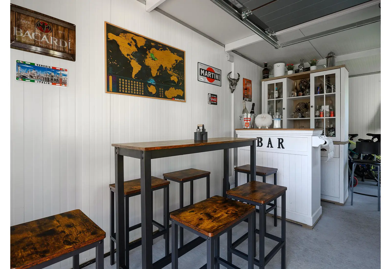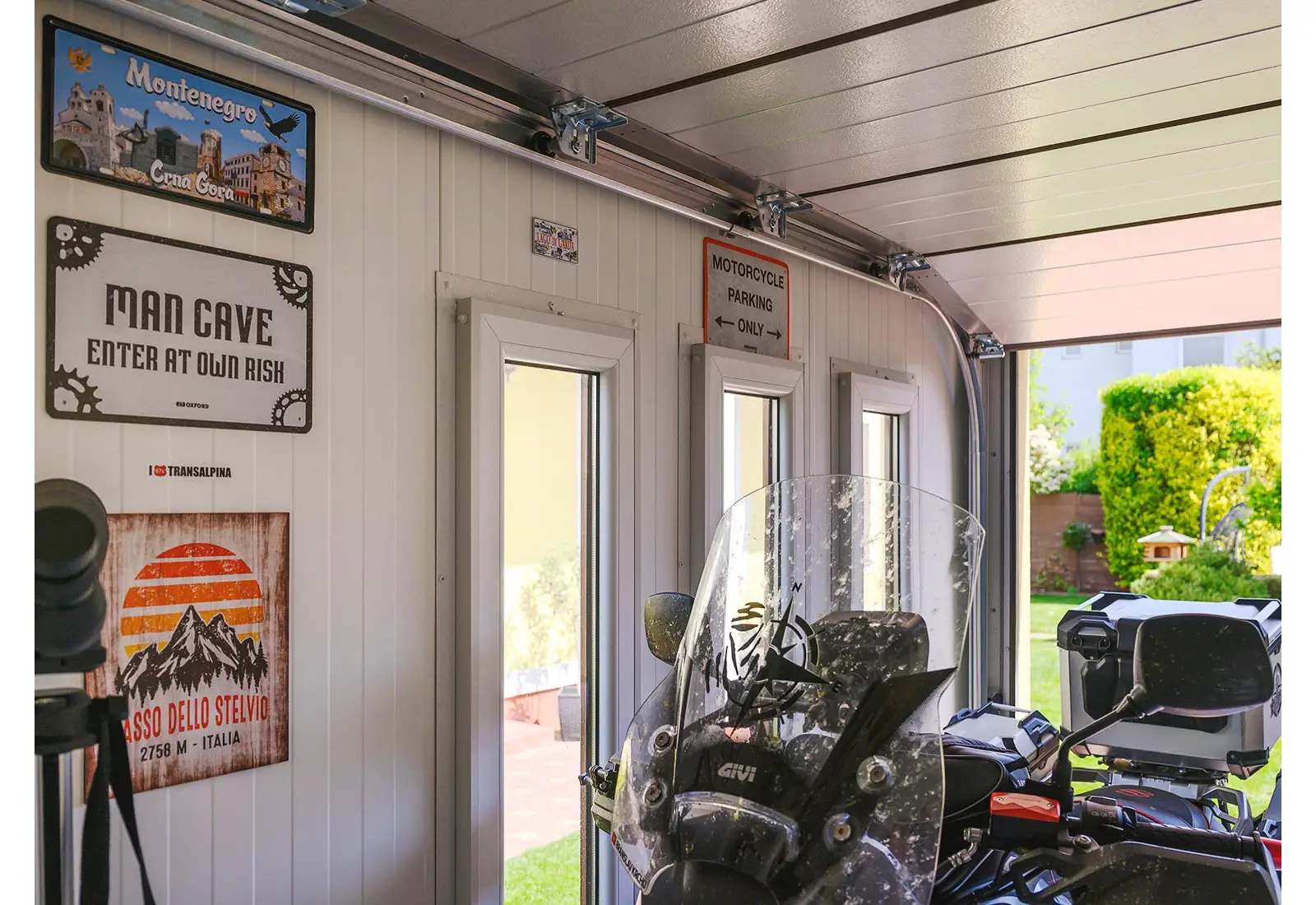 Garáž snů existuje! Prostorná montovaná garáž se špičkovými garážovými vraty Hörmann má zabudované osvětlení a lze ji napájet solárními panely. Bezpečnostní vrata se šikovně zavírají ke stropu, čímž šetří místo. Ultratiché otevírání a zavírání vrat je skvělým bonusem.