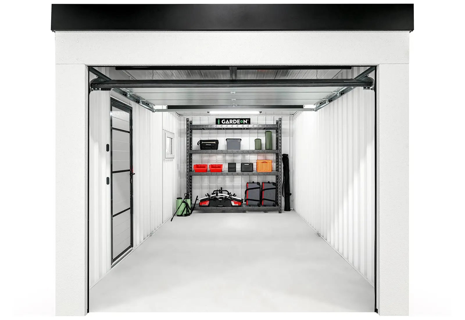 Garáž snů existuje! Prostorná montovaná garáž se špičkovými garážovými vraty Hörmann má zabudované osvětlení a lze ji napájet solárními panely. Bezpečnostní vrata se šikovně zavírají ke stropu, čímž šetří místo. Ultratiché otevírání a zavírání vrat je skvělým bonusem.